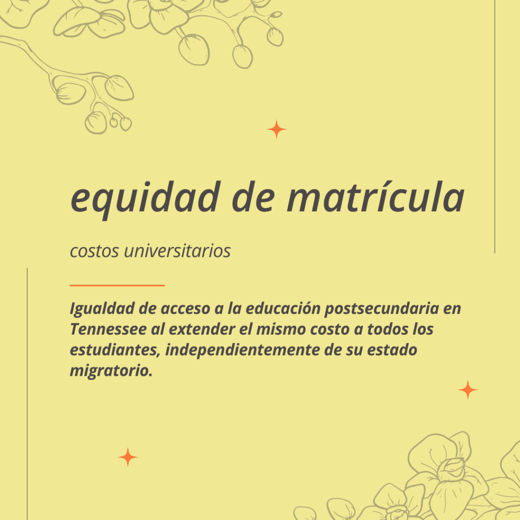 En muchos sentidos, los estudiantes latinos que buscan educación superior no tienen las mismas oportunidades que sus compañeros no latinos. La matrícula universitaria es una de estas áreas. Lo importante que debe saber es que los estudiantes indocumentados y marginalmente documentados se ven obligados a pagar una matrícula fuera del estado, o un promedio de 3 veces más que sus vecinos por una educación universitaria. Para agregar a este problema, estos mismos estudiantes tampoco tienen acceso a la ayuda financiera federal. Luchar por la equidad en la matrícula significa pedir los mismos costos universitarios estatales para los jóvenes inmigrantes indocumentados y marginalmente documentados que se hayan graduado de las escuelas secundarias de Tennessee.